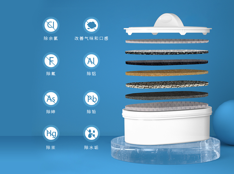 5级过滤层,主要采用日本进口载银活性碳。有效去除余氯、水垢、异味、铅、砷等。 满足海外认证标准,不含双酚A。
